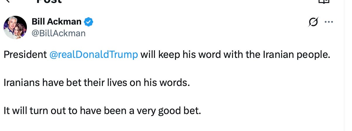 And it isn’t because Ackman wasn’t paying attention. On X, he had been virtually begging Trump to attack Iran since January (and even before then), pleading with the president not to abandon the Iranian people. He was confident in Trump’s ability to “come to their aid” during the anti-government protests in Iran.