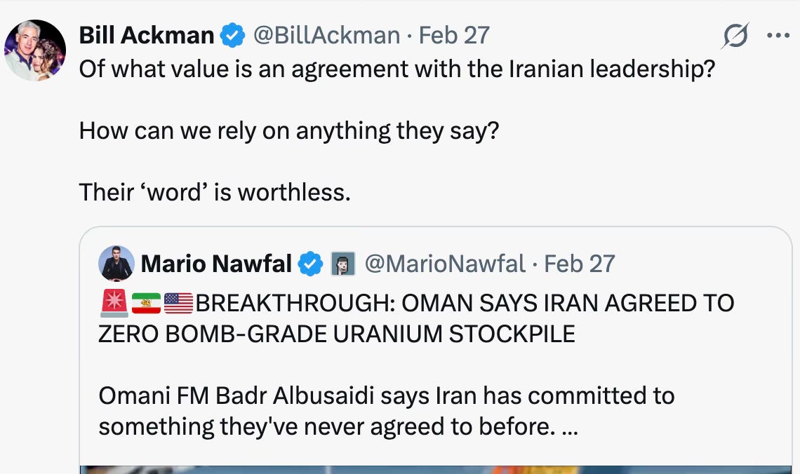 And just one day before the strike on Iran, when an Oman negotiator claimed the country had made substantial concessions during talks with the US, Ackman practically screamed: “Stop negotiating.”